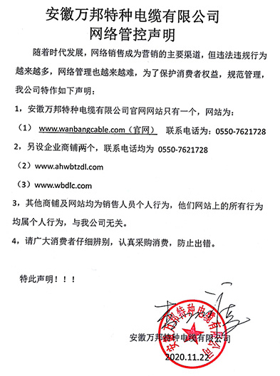 鄭重聲明:安徽萬邦特種電纜有限公司官方網站為:www_wanbangcable_com.xabybo920.com,除此之外無任何子網站或合作網站,其余均為假冒偽劣。電話:0550-7621728 13485756353 地 址:安徽省天長市滁州高新技術產業開發區經四路29號
